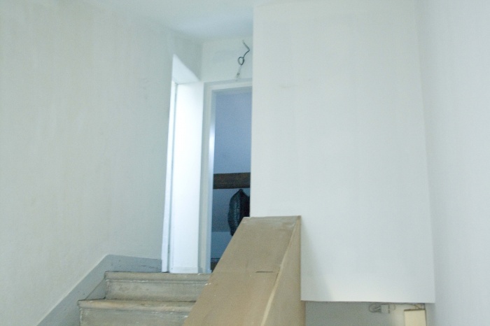 Nous avons créé un caisson en structure bois de forme triangulaire reprenant la forme de la volée d'escalier pour venir privatiser l'escalier du duplex du reste de l'immeuble. À l'origine le caisson devait être une boîte lumineuse en danpalon. C'est en cours de réflexion.